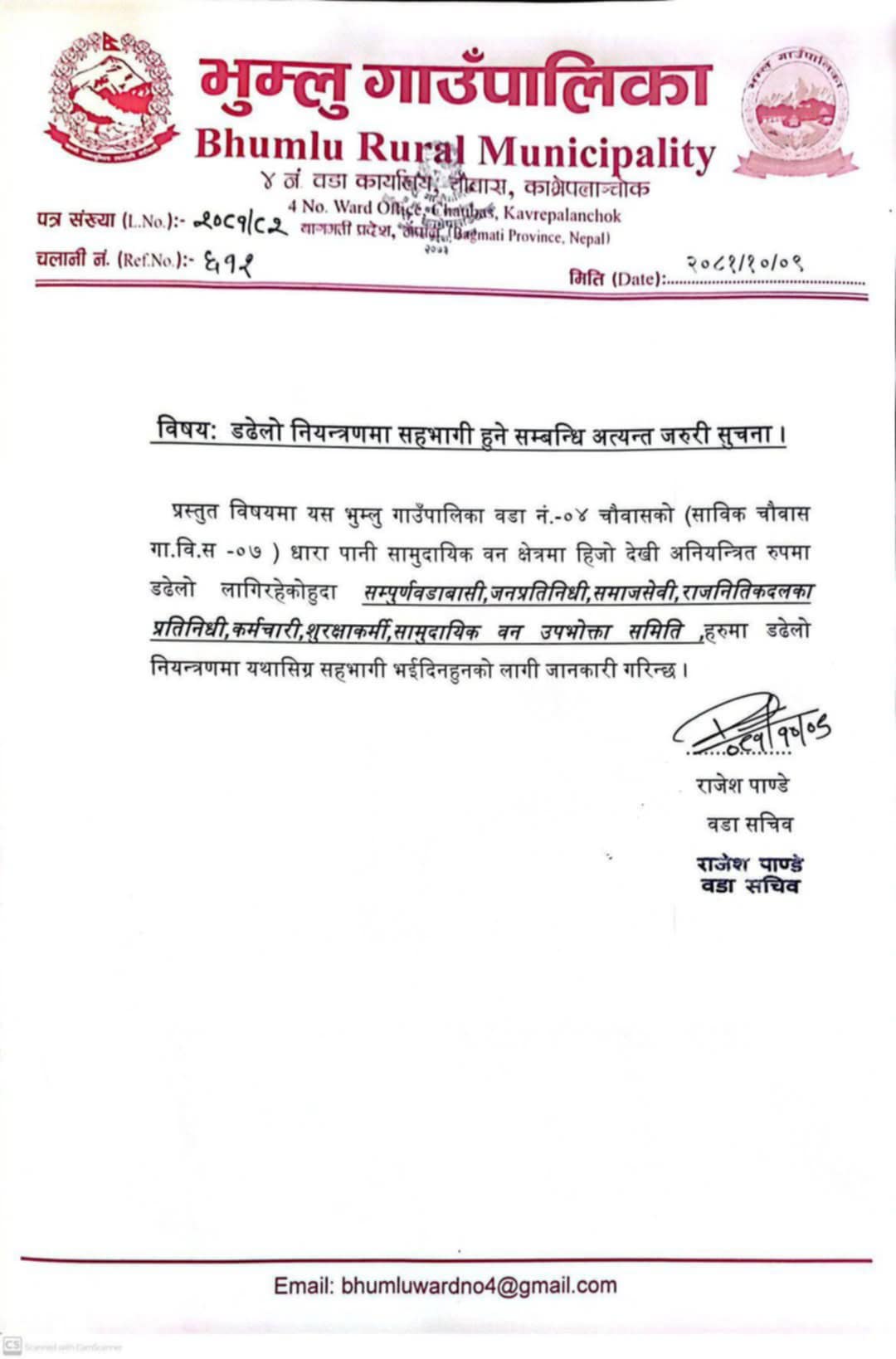त्यस्तै भुम्लु गाउँपालिका वडा नं ४ चौवासको धारपानी सामुदायिक वन क्षेत्रमा मंगलबारदेखि अनियन्त्रित रुपमा लागेको डढेलो लागेको सूचना नै जारी गरेको छ । आगो नियन्त्रणमा सहयोग गर्न वडा कार्यालयले सबैसँग अनुरोध गरेको छ ।