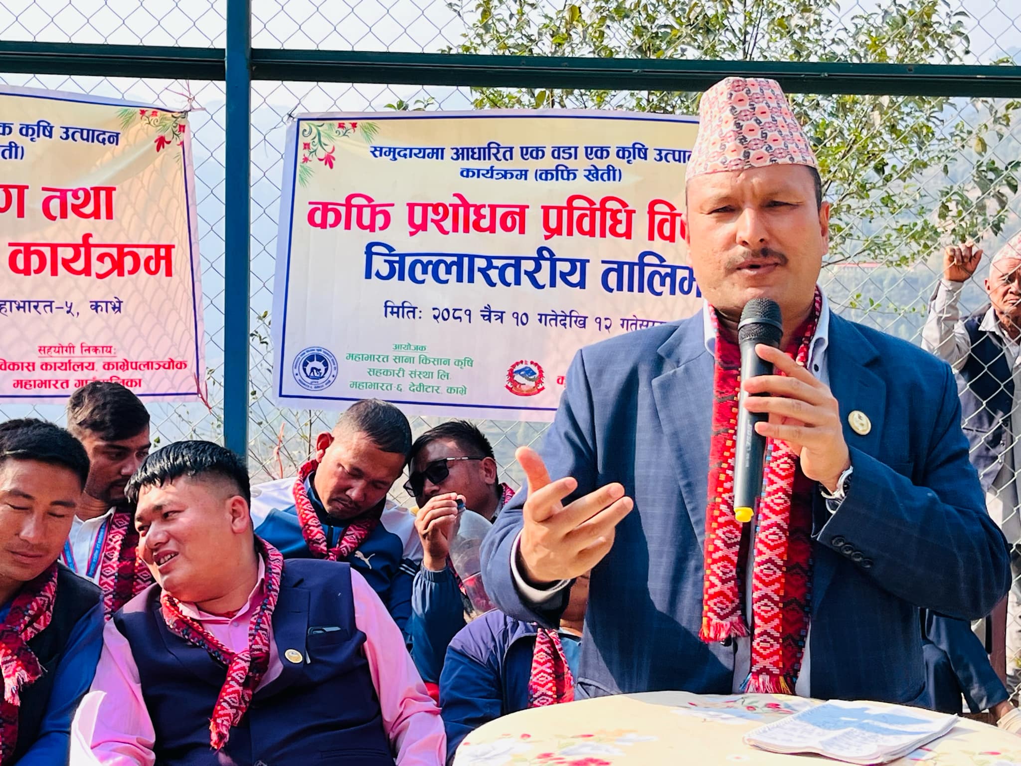 कृषि विकास कार्यालय काभ्रेपलाञ्चोकका प्रमुख कुलप्रसाद दवाडीले महाभारत गाउँपालिकामा गत वर्षबाट समुदायमा आधारित एक वडा एक उत्पादन कार्यक्रम सञ्चालन हुँदै आएकोमा यसवर्ष किसानहरुले गर्दै आएको कफी उत्पादनको क्षेत्रमा उत्पादन गुणस्तर र उत्पादकत्व बृद्धिका लागि कफी प्रशोधन प्रविधि तालिम प्रदान गरेको बताउनुभयो । जिल्लाको डाँडापारिको महाभारत गाउँपालिकामा कफी उत्पादनको योजना सम्झौता गरेर काम गरिसकेको र खानीखोला गाउँपालिकामा सम्झौता गर्ने चरणमा रहेको उहाँले बताउनुभयो ।