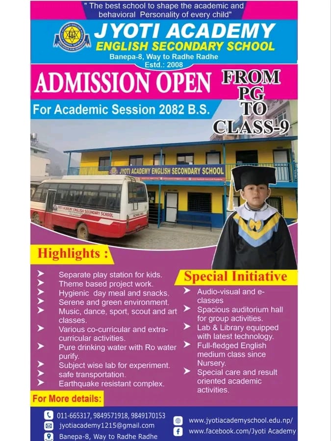 ज्योती एकेडेमीले आफूलाई फरक रुपमा पेस गरिरहेको छ । शिक्षा, अतिरिक्त कृयाकलाप र खेलकुलाई एकैसाथ अघि बढाएर बनेपामा मात्रै हैन काभ्रेपलाञ्चोक जिल्लामै उत्कृष्ट बन्ने होडमा लागेको छ ।