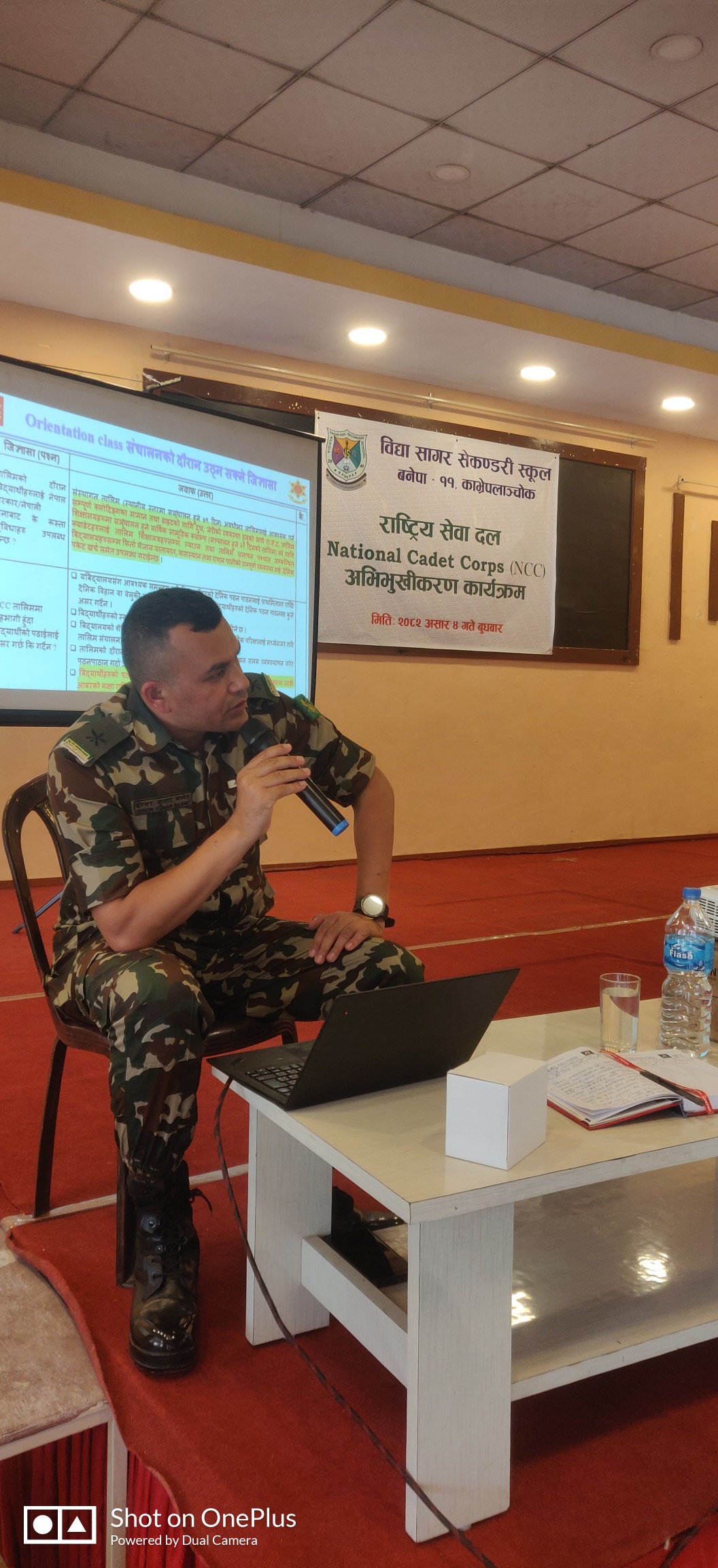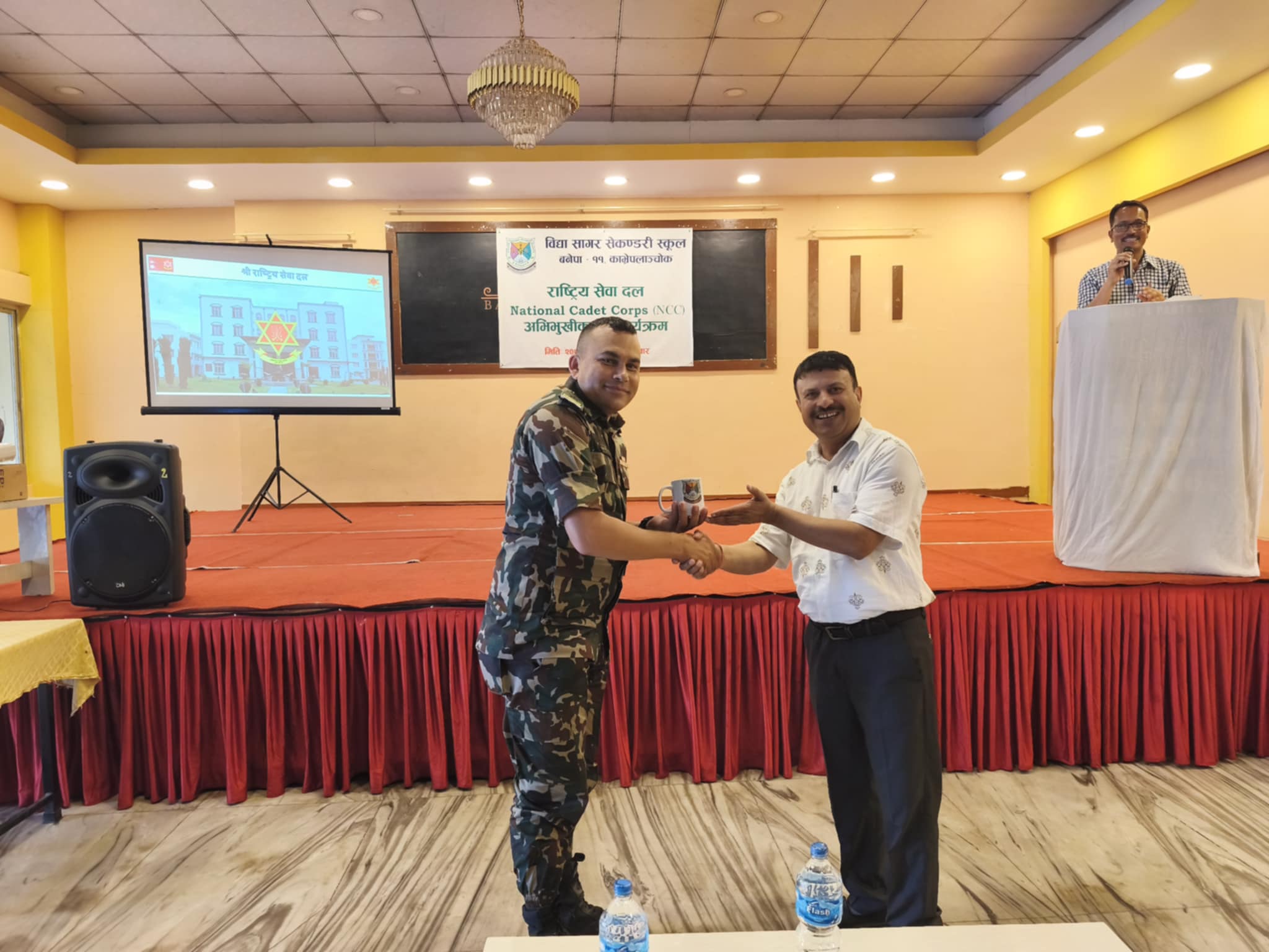 बनेपा÷अनुशासन नै राष्ट्रको सेवाको मूल जग हो” भन्ने आदर्श बोकेको राष्ट्रिय सेवा दल (एनसिसी) युवा विद्यार्थीको चरित्र, नेतृत्व गुणस्तर, खेलकुद भावना, निःस्वार्थ सेवाको आदर्श भावनाको विकास गरी जीवनका सबै क्षेत्रमा समर्पित नेतृत्व क्षमता अभिवृद्धि गर्न सफल भएको संस्था हो । काभ्रेकै पुरानो र प्रतिष्ठित विद्यालय विद्या सागर ईङ्गिस सेकेण्डरी स्कूल बनेपा–१० मा यो बर्षबाट एनसिसीको कक्षा संचालन गर्ने भएको छ । यसै सन्र्दभमा बुधबार विद्यालयमा असल नागरिक र भविष्यमा नेतृत्वदायी भूमिका निर्वाह गर्न सक्षम कर्णधार तयार गर्ने लक्ष्य बोकेको अन्तर्राष्ट्रिय सञ्जाल भएको संस्था भएकाले यसले किशोर किशोरीमा सकारात्मक चिन्तन र अनुशासन सिकाउने नेपाली सेनाको श्री मेहर गण धुलिखेलले विद्यार्थी र अभिभावकसँग अन्तरकृया कार्यक्रमको आयोजना गरेको छ । गणका सेनानी ईश्वरकुमार बस्नेतले अभिमुखीकरण गर्नुभयो ।