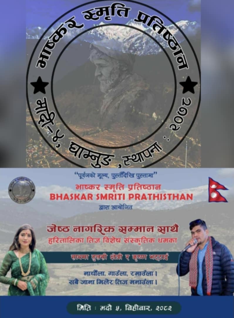 पूर्वजको मुल्य पुस्तौ देखि पुस्तामा उद्देश्य द्वारा स्थापित भास्कर स्मृति प्रतिष्ठान द्वारा जेष्ठ नागरिक सम्मान कार्यक्रम हुने भएको छ । आउँदो ५ भदौ का दिन पोखरा १३ काउखोला भाटसमाज सो कार्यक्रम साथै हरितालिका तीज बिशेष कार्यक्रम हुने भएको छ ।