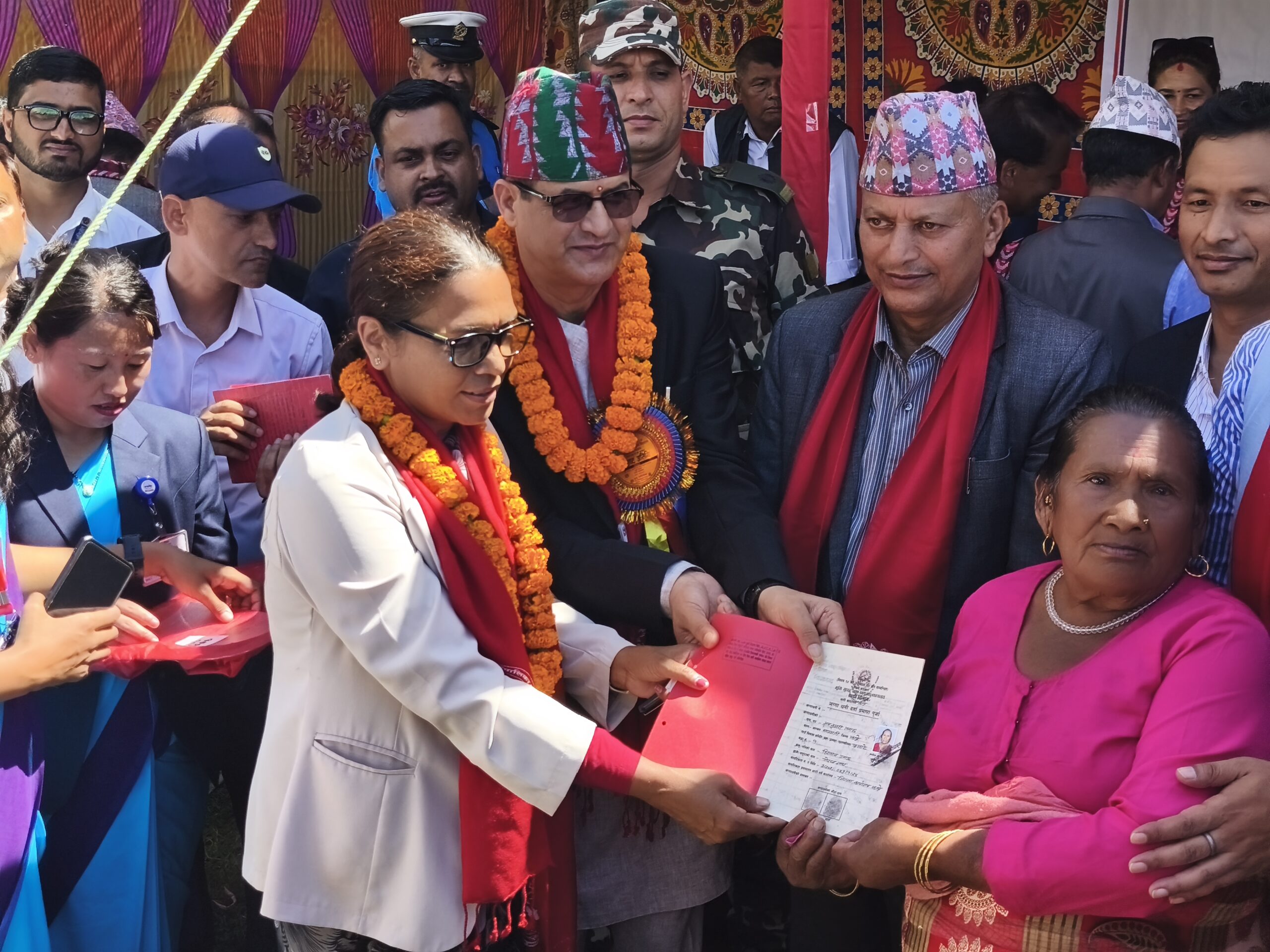 भू व्यवस्था सहकारी तथा गरिबी निवारण मन्त्री बलराम अधिकारीले लालपुर्जा हस्तान्तरण गर्दै भूमि सम्बन्धि दीर्घकालिन समस्या समाधान गर्न सरकारको प्राथमिकतामा रहेको बताउनुभयो ।