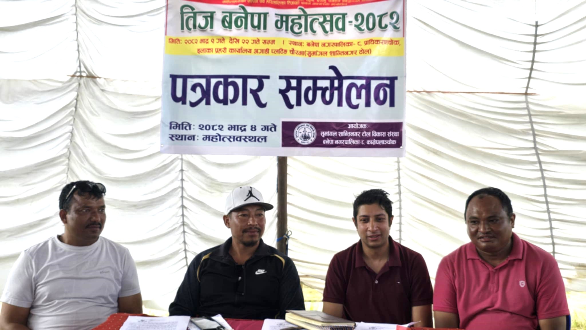 बनेपा – जिल्लाको बनेपामा तिज बनेपा महोत्सव २०८२ यहि भाद्र ९ गते सोमबार देखि हुने भएकाछन् । औद्योगिक व्यापार, परम्परागत कला संस्कृति, कृषि, घरेलु, पर्यटन प्रवद्र्धनको निमित्त महिलाहरुको महान पर्व हरितालिका तिजको पावन अवसरमा तिज बनेपा महोत्सव २०८२ हुने भएको छ । सुमांगल शान्तिनगर टोल विकास संस्था, बनेपा नगरपालिका–८, काभ्रेको आयोजनामा भदौ ९ गतेदेखि भदौ २२ गते सम्म महोत्सव संचालन हुने बुधबार पत्रकार सम्मेलन मार्फत आयोजकले जानकारी दिएको छ । बनेपा–प्राधिकरण चोक, इलाका प्रहरी कार्यालय अगाडि सुमांगल शान्तिनगर टोलमा महोत्सव हुन लागेको हो ।
